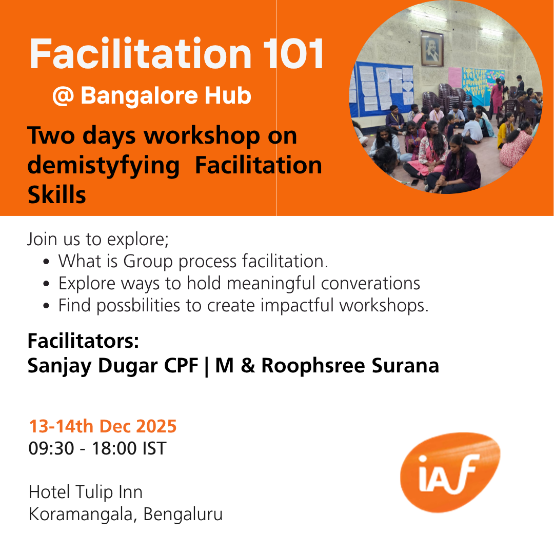 December 13 - December 14 Facilitation 101 Tulip Inn 100 Feet Road, Ashwini Layout, Koramangala, Bengaluru Urban, Bengaluru, Karnataka Two days workshop on demistyfying Facilitation Skills Join us to explore; What is Group process facilitation. Explore ways to hold meaningful converations Find possbilities to create impactful workshops. Read More Register